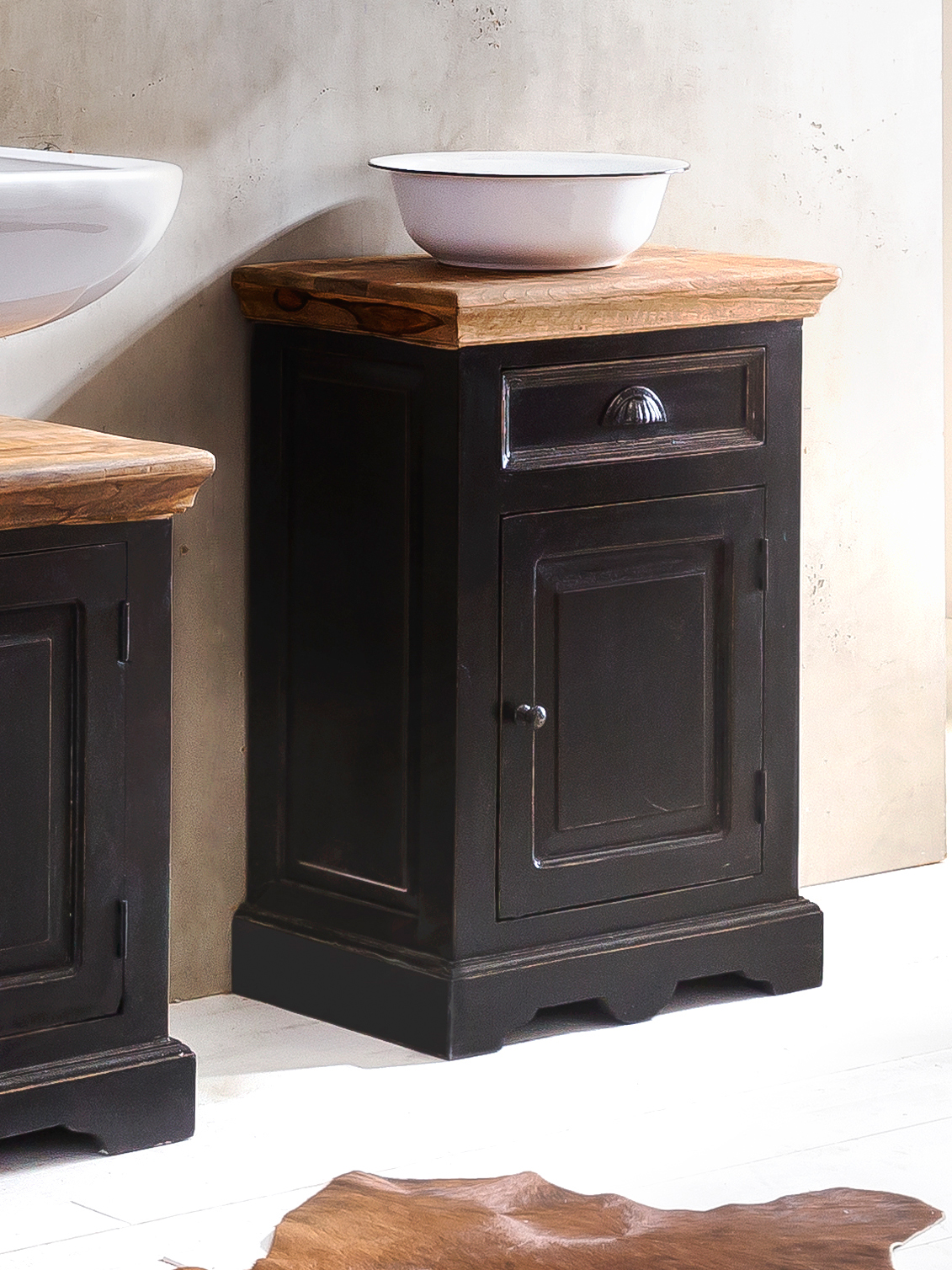 Dieser Badschrank wirkt in jedem Badezimmer sehr edel. Ausgestattet mit 1 Tür und einem Schubkasten bietet der Schrank ausreichend Stauraum für Kosmetika, Handtücher und weitere Accessoires. Die honigfarbene Deckplatte des Badezimmerschranks lädt zum Dekorieren ein oder – je nach Platzanspruch – auch als weitere Ablagefläche. Die Neutralität seiner Erscheinung lässt es zu, dass man ihn durchaus auch als kleinen Dielenschrank oder Garderobenschrank oder sogar als Nachtkommode verwenden kann. Hier sind der Fantasie keine Grenzen gesetzt, denn das schwarze Holz aus Mango lässt sich hervorragend mit modernen Möbeln kombinieren. 1 Tür, 1 Schublade Türanschlag wählbar universell einsetzba honigfarbene Deckplatte Anschlag wählbar Muschelgriffe an den Schubladen Kommode aus der Serie CORSICA