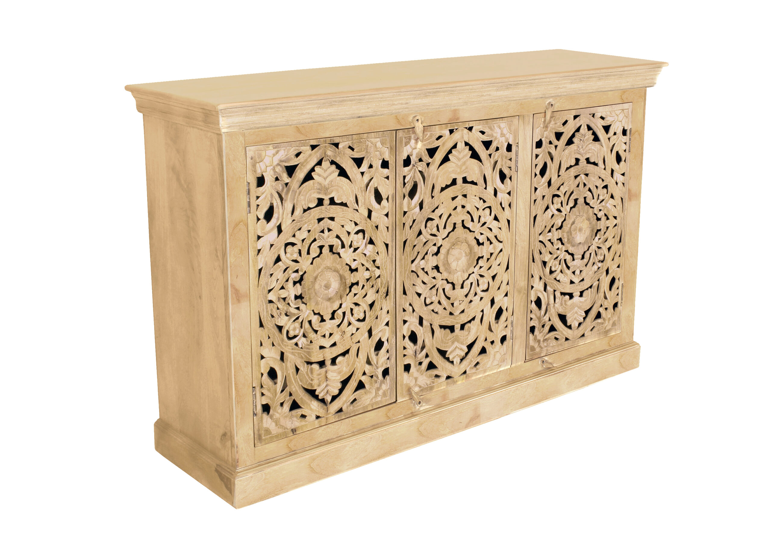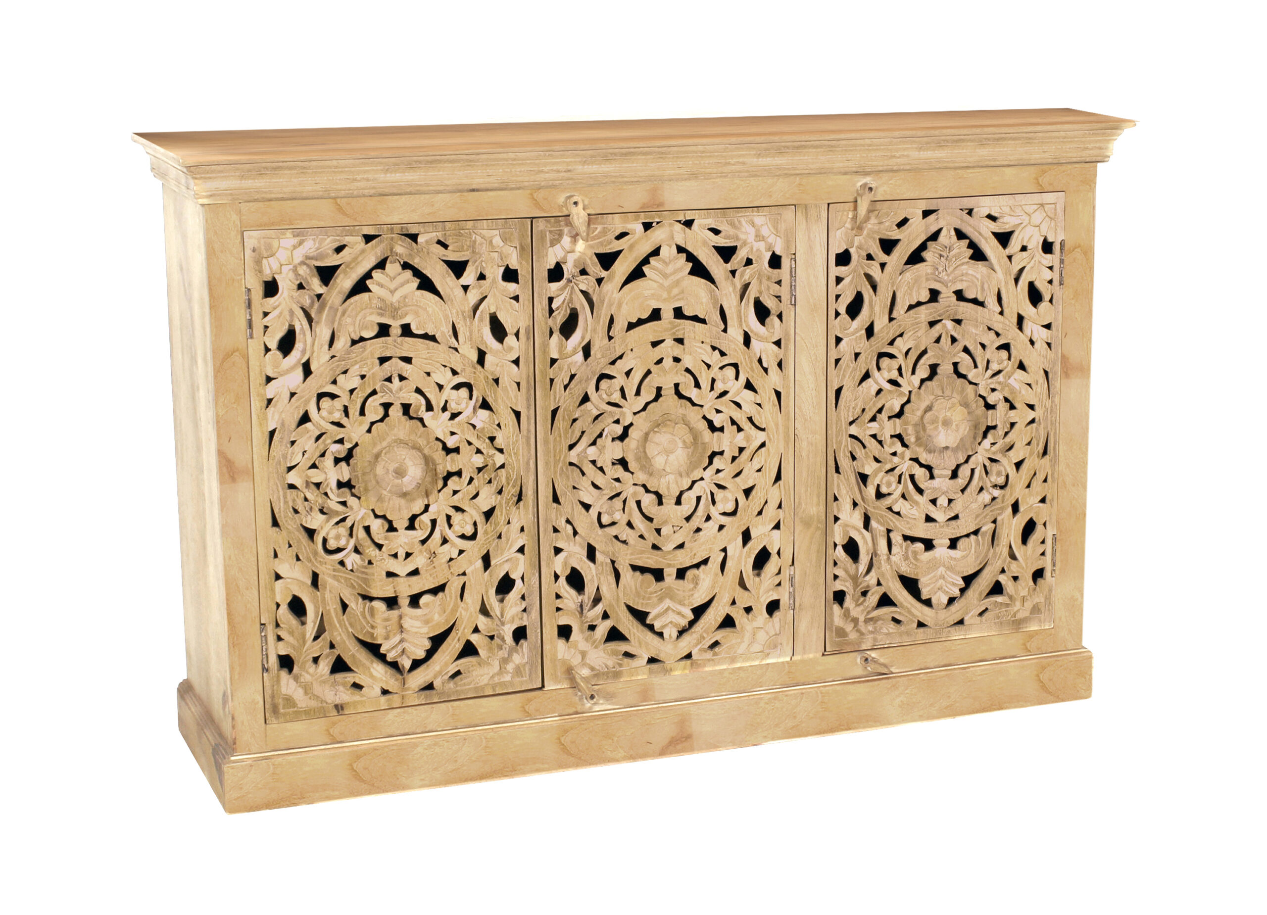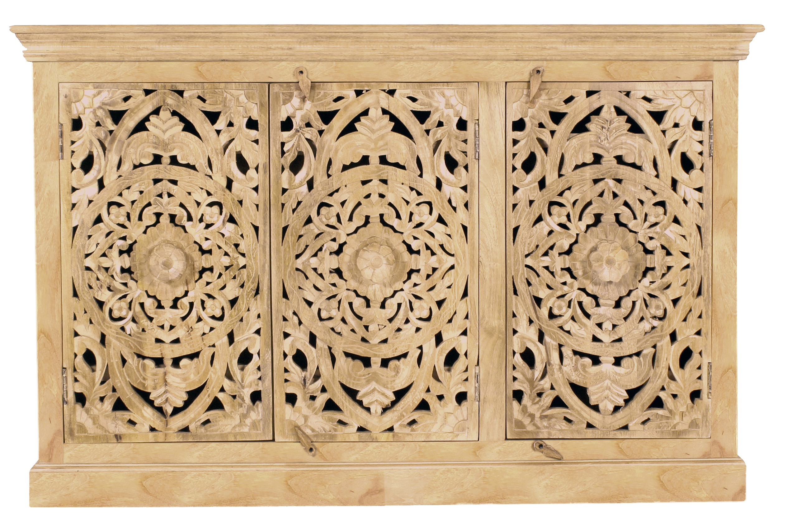 Dieses Sideboard aus Mangoholz in einem hellen Naturton wertet Ihre Räumlichkeiten auf. Die Kommode bietet hinter drei Türen mit je einem Einlegeboden genügend Stauraum für vielerlei Dinge. Auf dem Schrank können Sie ein paar Dekoartikel, Pflanzen oder Bilder abstellen. Das Sideboard lässt sich problemlos in modernes Mobiliar integrieren – als zusätzlicher Dielenschrank, im Esszimmer oder Wohnbereich. Die aufwändigen Schnitzereien an der Front machen ihn zu einem absoluten Hingucker, um den Ihre Freunde sie beneiden werden. Jedes Teil ist ein Einzelstück von Wert. 3 Türen je 1 fester Boden hinter den Türen, Maße der Fächer links 83x33x33 cm, rechts 43,5x33x33 cm, Höhe des Sockels 8 cm viel Stauraum mit aufwändigen Schnitzereien stabile Ausführung mit 3 Türen, hinter denen sich jeweils 1 fester Boden befindet Sideboard aus der Serie LAKADEE