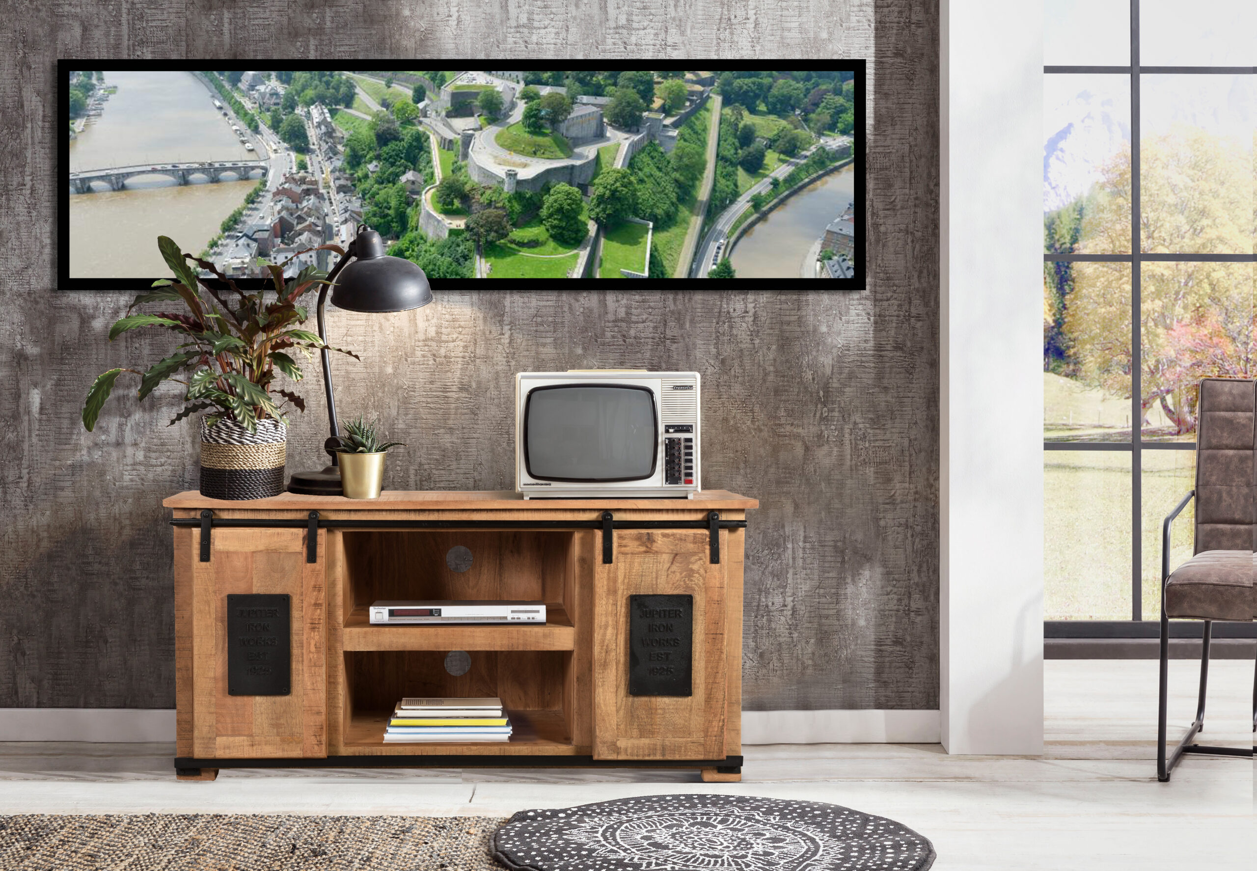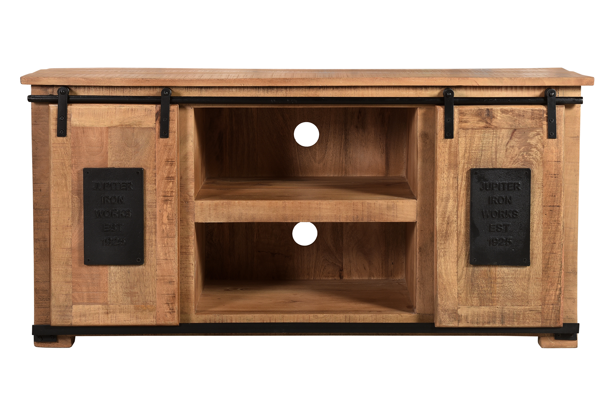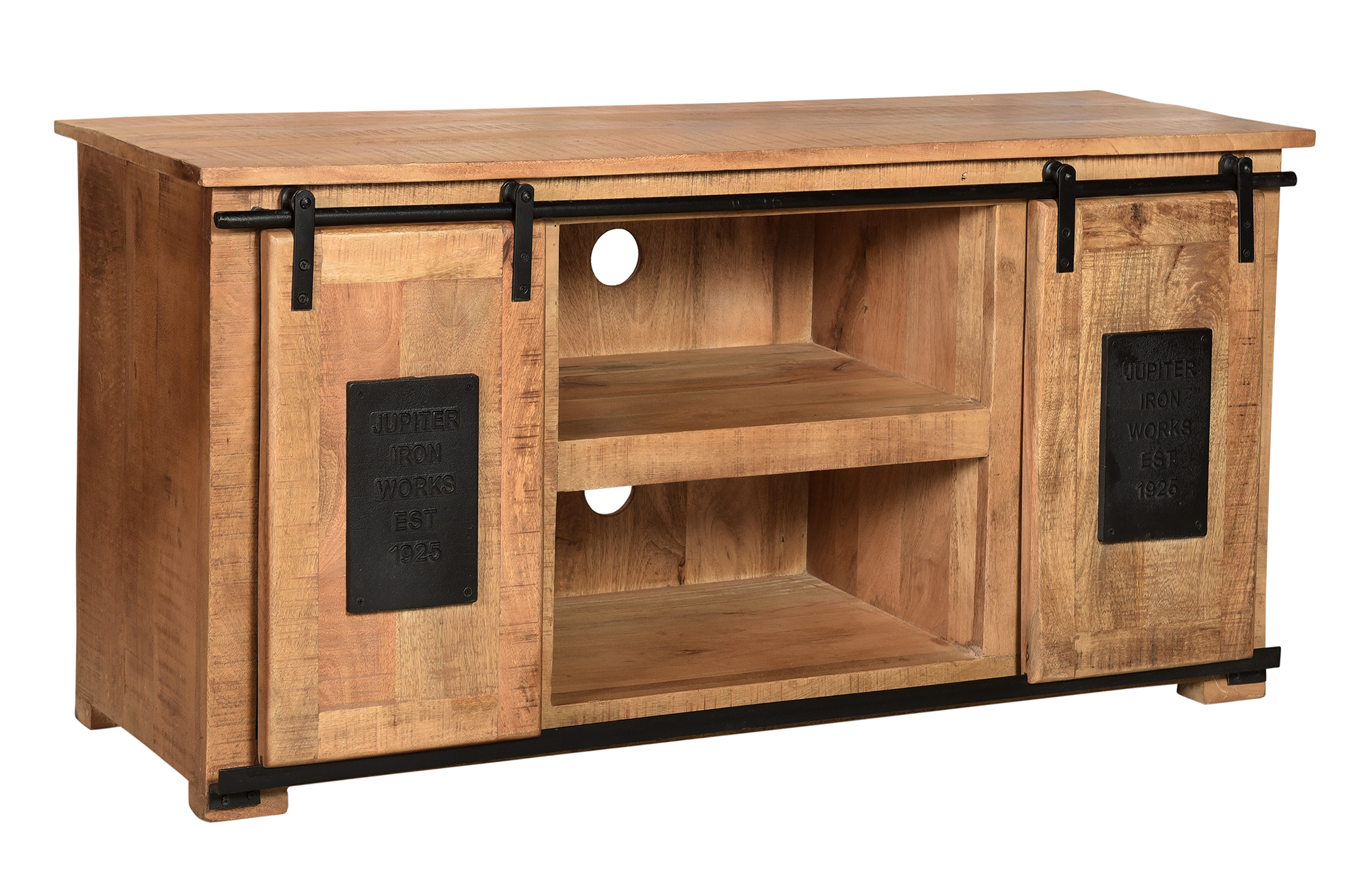 Die Kombination aus naturfarbigem Mangoholz und schweren Metallbeschlägen in antikschwarz bieten einen reizvollen Kontrast und verleihen dem Lowboard einen rustikalen Charme. Durch die natürliche Optik des Mangoholz passt es gut zu vielen verschiedenen Wohnstilen. Das Lowboard bietet mit zwei offenen Fächern Platz für Ihre HiFi-Geräte, durch Löcher in der Rückwand ist die Kabeldurchführung kein Problem. Zwei weitere Fächer, die durch Schiebetüren verschlossen werden, bieten weiteren Stauraum, wobei die Schiebetüren bei Bedarf auch die mittleren Fächer verschließen können und dadurch die Optik der TV-Bank völlig verändern. Schönheit und Nutzen sind hier also kein Widerspruch. 2 Schiebetüren, 2 offene Fächer Fachmaße 45x37x22 cm, hinter den Türen 35/28x34x48 cm, keine Böden mit 2 praktischen und platzsparenden Schiebetüren rustikale, antikschwarze Beschläge aus Metall 2 offene Fächer für Kabeldurchführung aus natürlichem Mangoholz Lowboard aus der Serie NAMUR