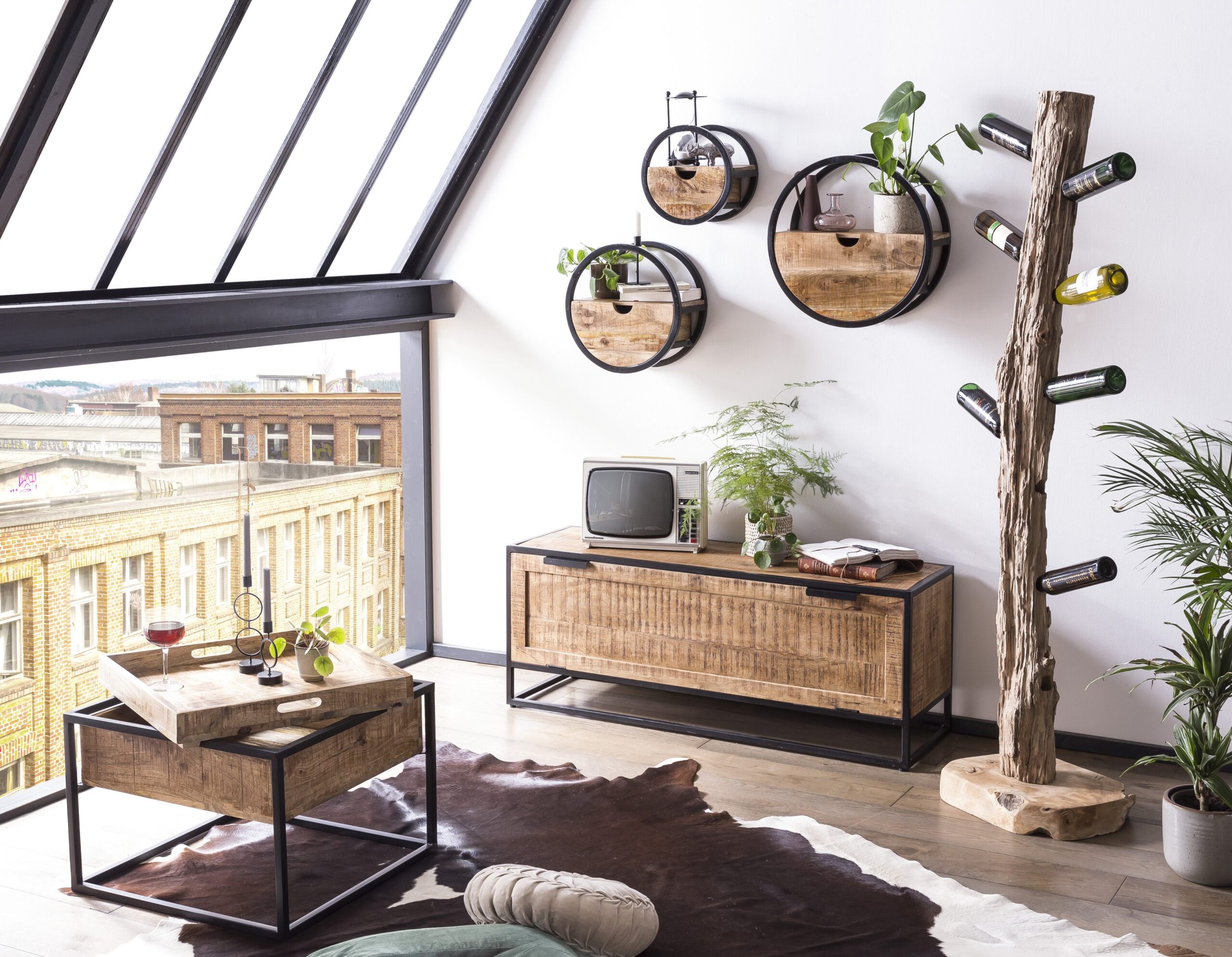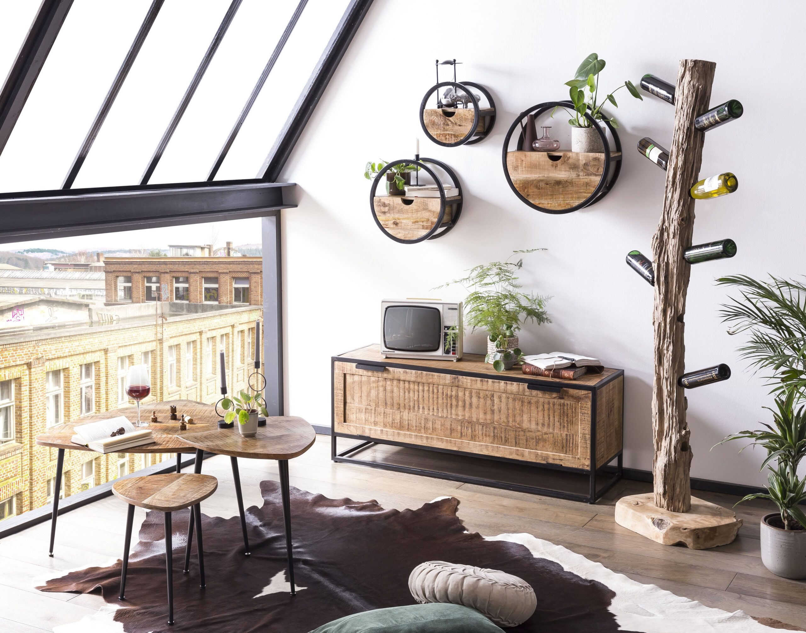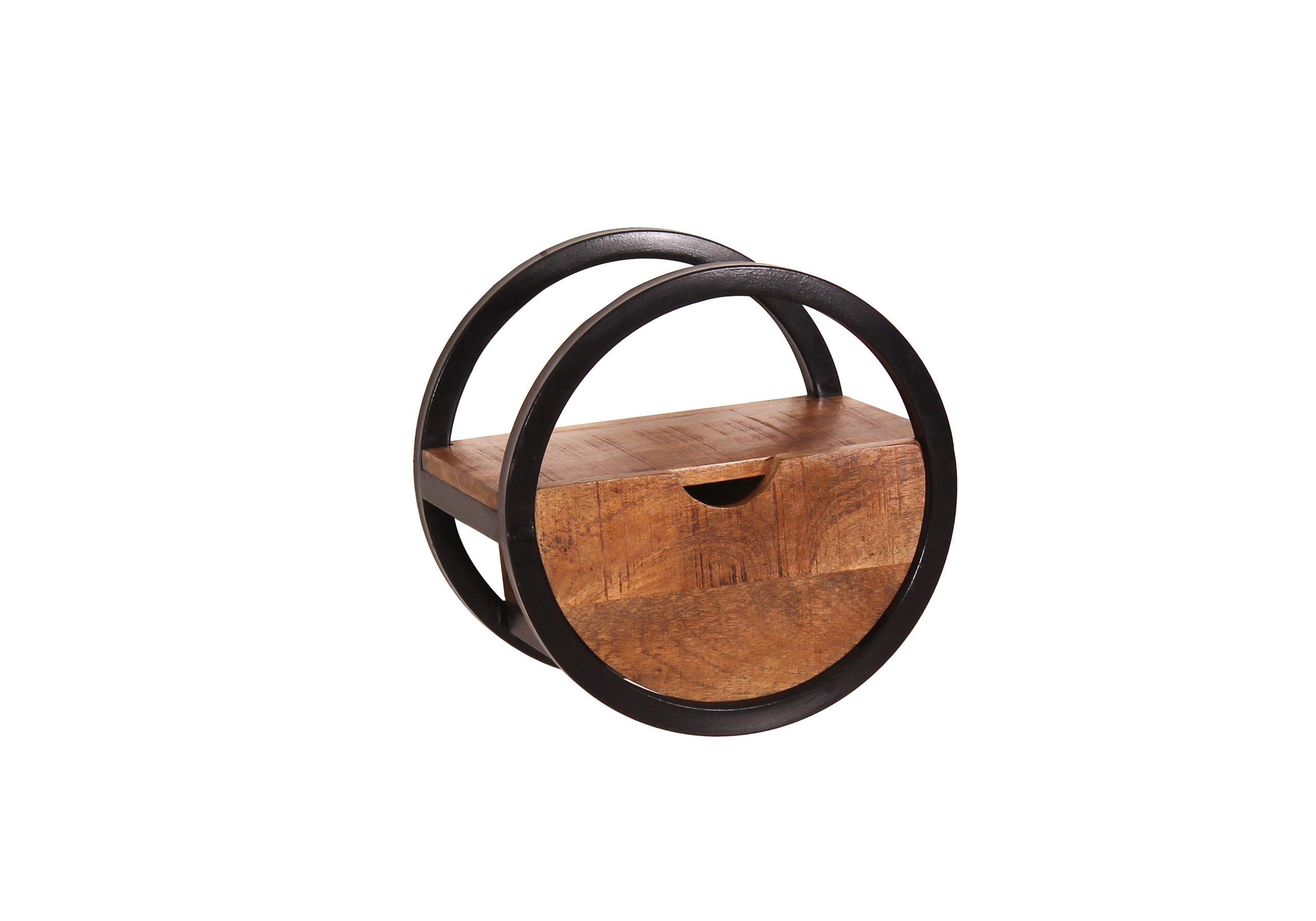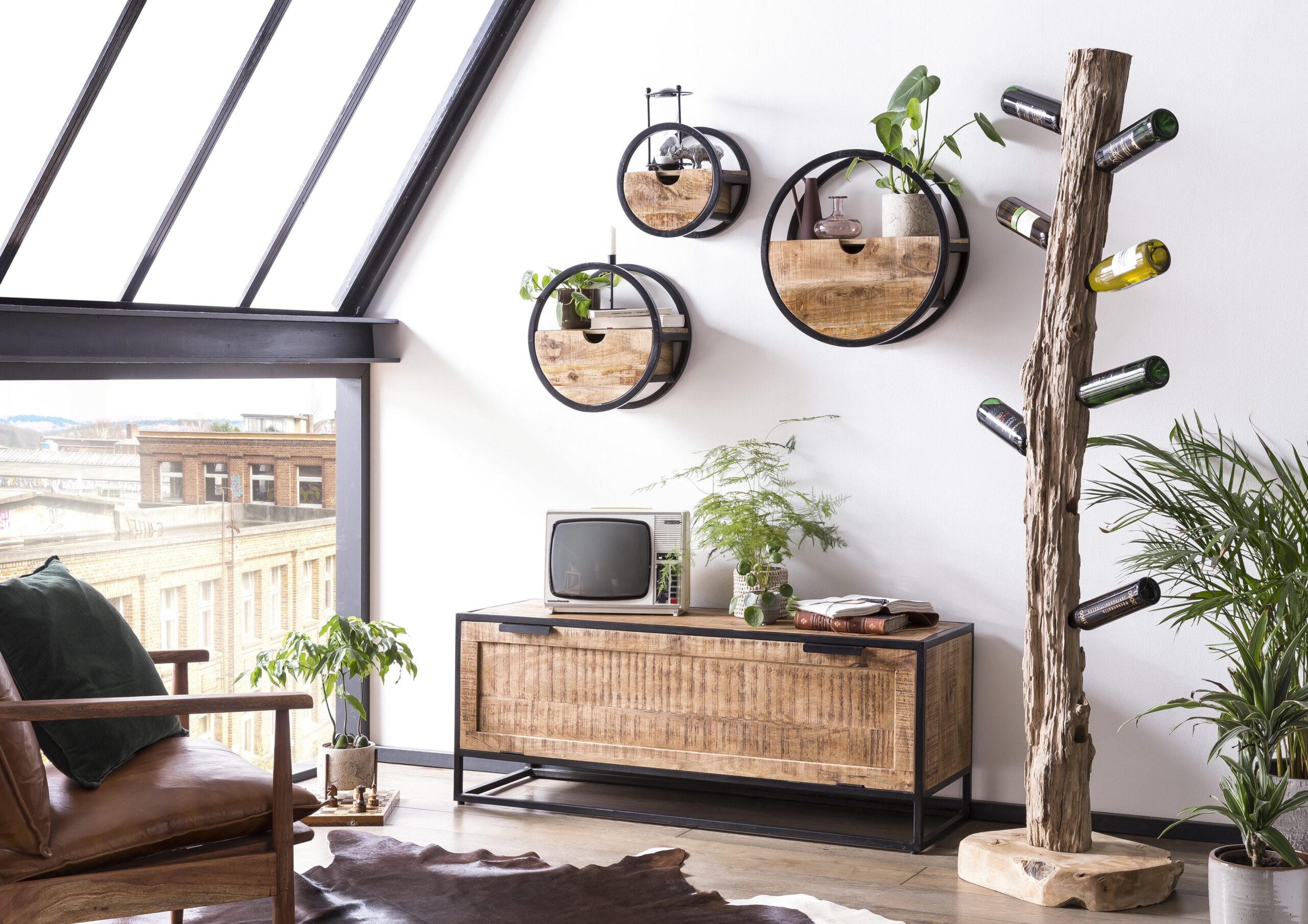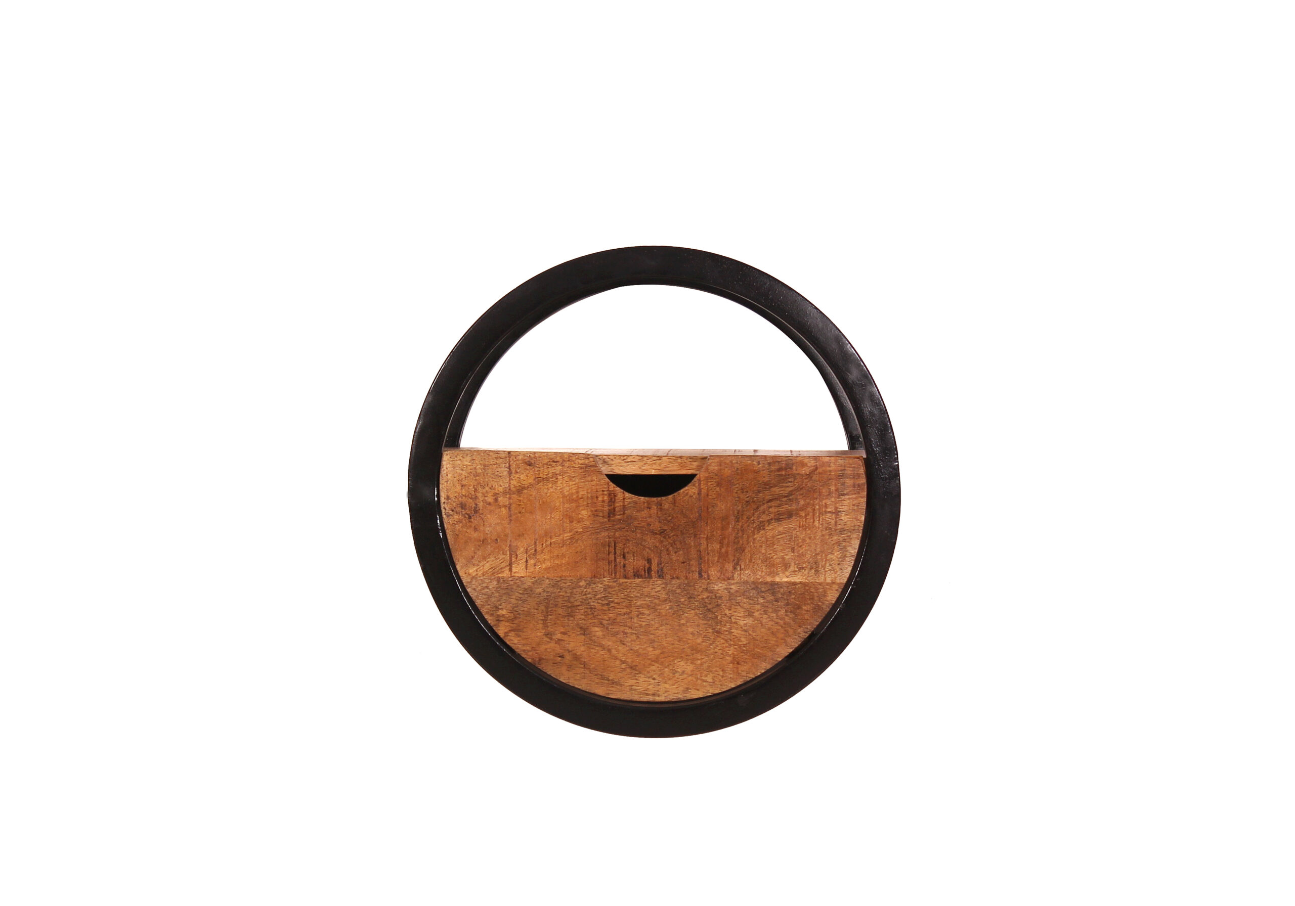 Dieses zauberhafte Wandregal hebt sich von der Masse ab. Das runde Regal aus naturfarbigem Mangoholz und einem antikschwarzen Metallrahmen können Sie ganz individuell gestaltet aufhängen und somit Ihrer Kreativität freien Lauf lassen. Der Industrial-Look ist dabei ein absoluter Eyecatcher. In der Schublade finden kleinere Dinge ihren Platz, auf der Ablage können Sie Dekoartikel platzieren. Das Massivholzregal ist vielseitig einsetzbar und kann in vielen Räumlichkeiten genutzt werden. 1 Schublade runde Form Wandregal im Industrial Look interessanter Materialmix aus Holz und Metall in vielen Räumlichkeiten verwendbar Schublade sorgt für zusätzlichen Stauraum Wandregal aus der Serie SIDNEY
