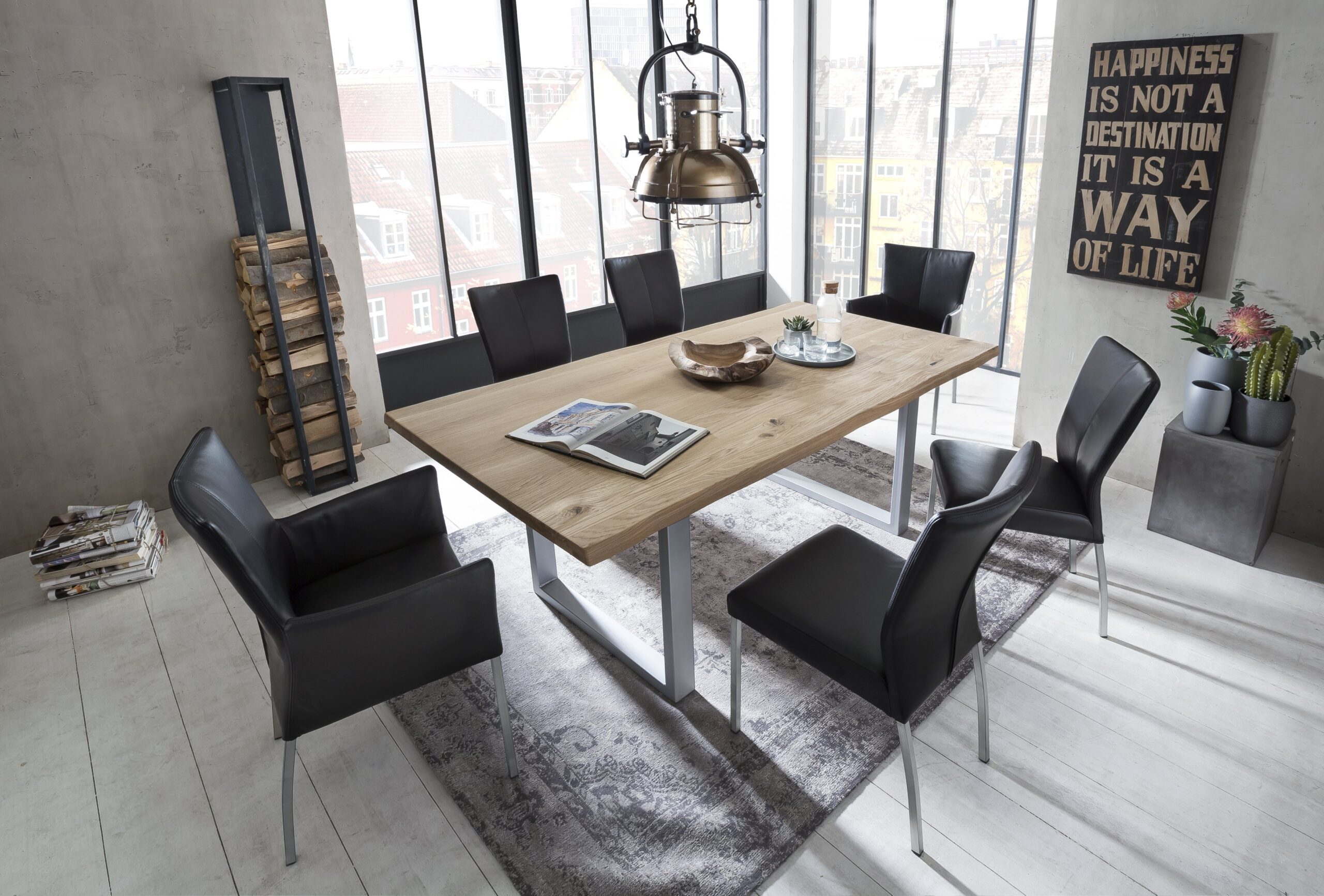 Esstische mit echter Baumkante sind die passende Wahl für ein Esszimmer mit Charakter. Die ausdrucksstarke Tischplatte aus Eichenholz ist dabei so individuell wie Ihr Wohnstil. Die deutlich sichtbare Holzmaserung und die naturgewachsene Form der beiden langen Tischkanten sind Merkmale, die Ihren Raum nicht nur wohnlicher machen, denn in Verbindung mit dem silbern gepulverten Metallgestell kommt auch ein zeitlos moderner Look einher. mit Baumkante wie gewachsen Plattenstärke 20 mm auf 40 mm aufgedoppelt, Platte aus durchgehenden Lamellen, Abstand zwischen den Beinen 151 cm, Abstand Gestell zur Kante 16,5 cm, Gestellbreite 8 cm mit Baumkante wie gewachsen jeder Tisch ein Unikat interessanter Materialmix Plattenstärke 20 mm auf 40 mm aufgedoppelt Platte aus durchgehenden Lamellen