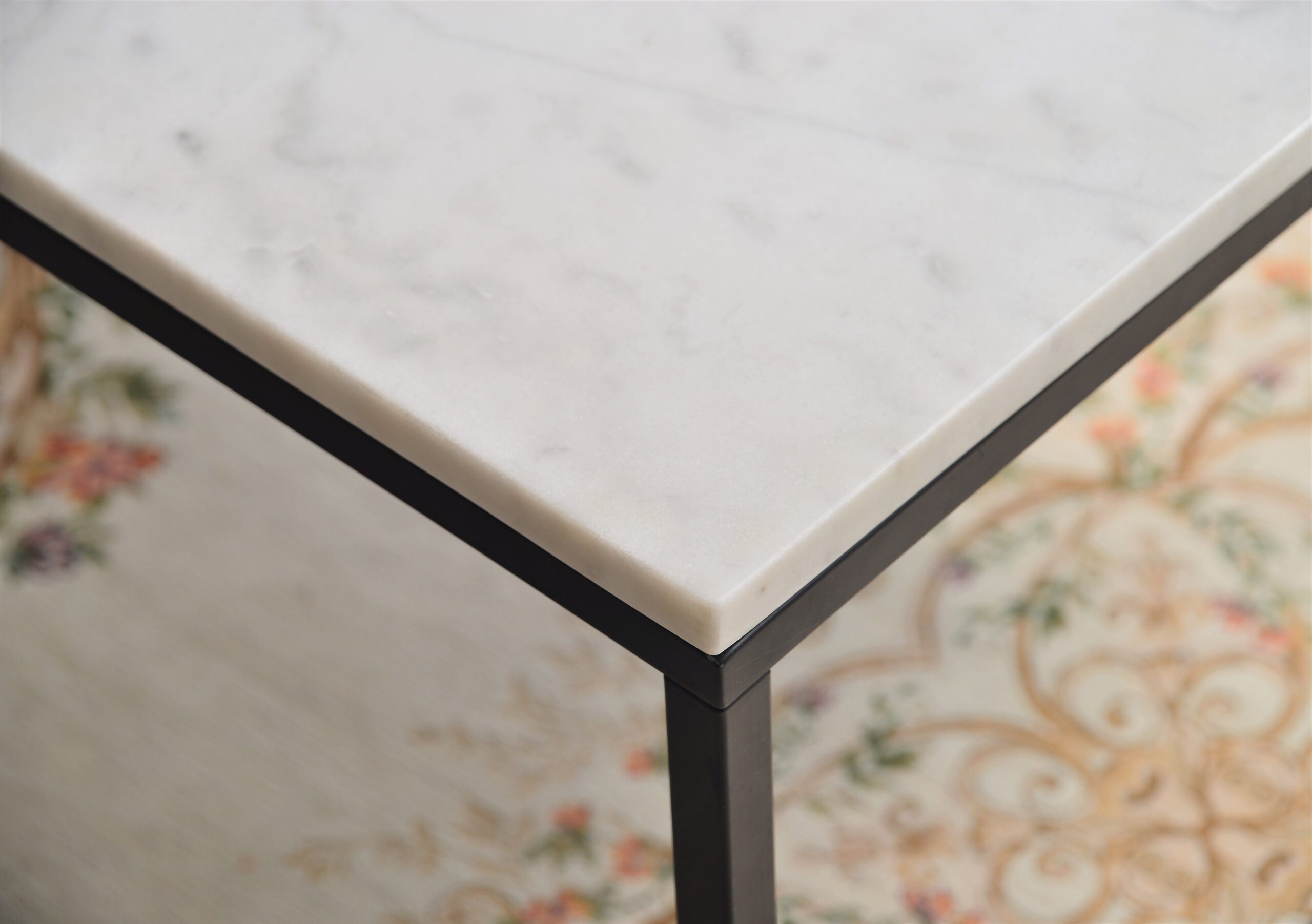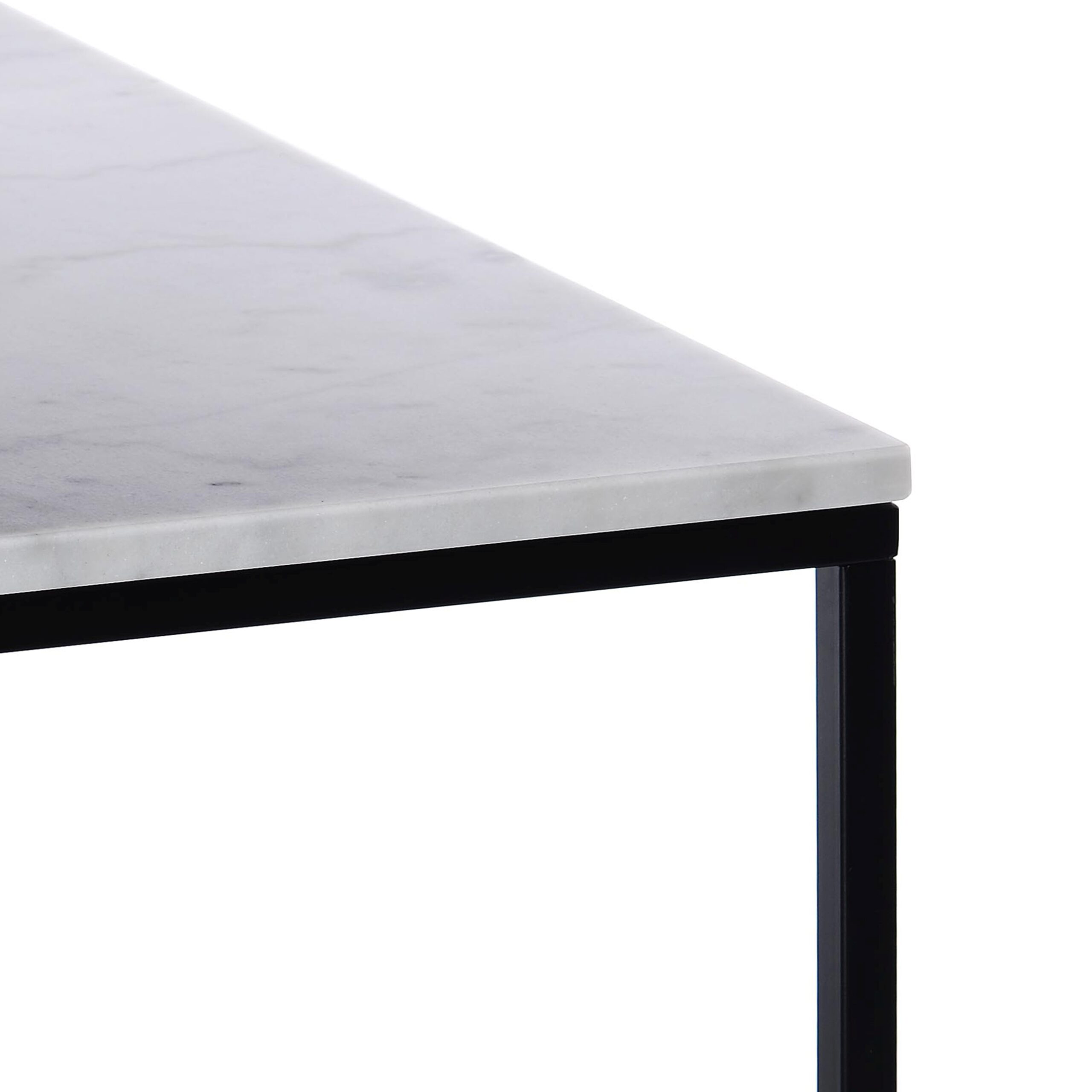 Echter Marmor, sorgfältig ausgesucht und poliert bis zum seidigen Glanz, dazu ein modernes Metallgestell in Seidenmatt, stark genug, um dem Gewicht Paroli zu bieten – klingt teuer. Ist es aber nicht, wodurch das Wohnen noch mehr Spass macht. Mit 75 x 75 cm Plattenmass und 48 cm Höhe haben Sie hier auch die richtigen Dimensionen um vor grösseren Sofas nicht unterzugehen. quadratisch, Gestell Metall, Platte Marmor Plattenstärke 18 mm, gerade Kante Couchtisch im außergewöhnlichen Design dezente Tischplatte aus elegantem Marmor in Weiß stabiles Gestell aus Metall in Schwarz als Sofatisch oder Beistelltisch geeignet sehenswerter Farb- und Materialmix