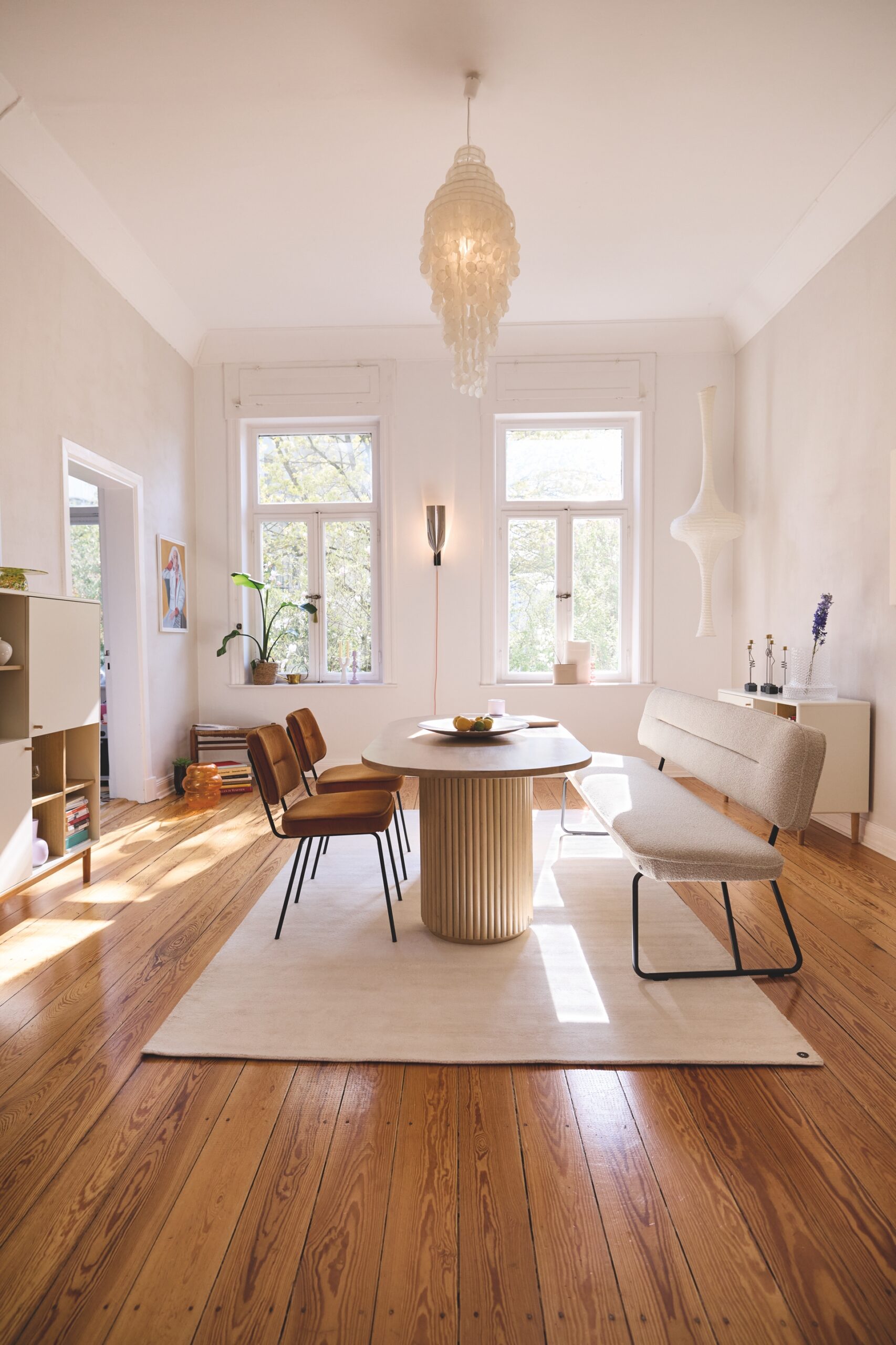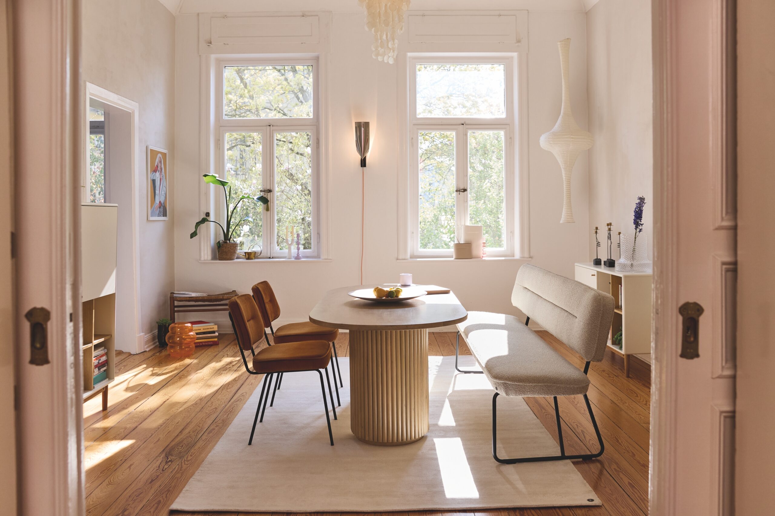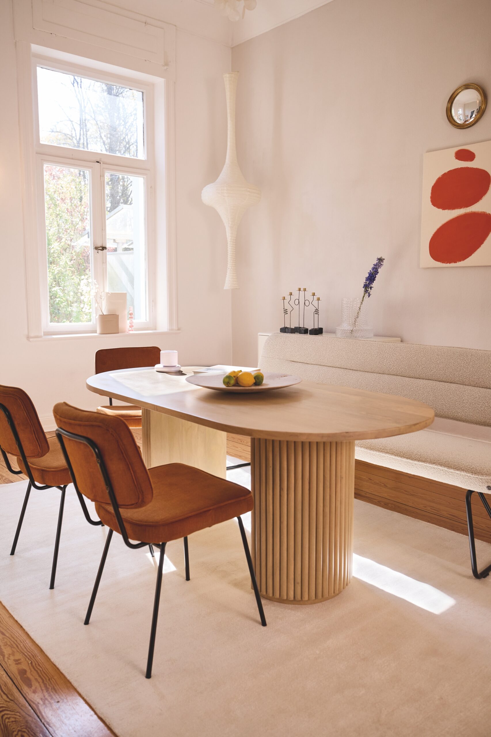 Besticht durch sein Design: Der hochwertige Esstisch »T-RIBBED TABLE LARGE« aus dem Hause TOM TAILOR wertet den Essbereich optisch sowie praktisch auf. Er besteht aus FSC®-zertifiziertem Mangoholz und wurde mit viel Liebe zum Detail verarbeitet. Sowohl die abgerundete Tischplatte als auch die extravaganten Tischbeine im Ribbed-Look machen ihn zu einem Hingucker. Durch die Farbgebung und Optik fügt er sich harmonisch in viele Einrichtungsstile ein. Das Tischmöbel erweitert die Wohnküche oder das Esszimmer um eine stylische Komponente, an der gerne Zeit verbracht und gegessen wird. Neben stylischer Mode entwickelt TOM TAILOR seit einigen Jahren auch Möbel im Premium Segment. Dabei setzt die Lifestyle Marke auf einen jungen und erfrischenden Stil: Das vielseitige Möbelsortiment hat für jeden Raum etwas zu bieten und überzeugt mit lässigem, urbanem Design. Die Gestaltung, insbesondere die Kombinationen von Materialien, Formen und Farben sind inspiriert von der aktuellen Mode. Immer am Puls der Zeit: Mit Möbeln von TOM TAILOR gelingt es, sich genauso modern einzurichten, wie zu kleiden. T-Ribbed Table Large Abstand zwischen den Tischbeinen: ca. 73 cm, Plattenstärke: ca. 3 cm, Maße Tischbein: ca. 45×24 cm, max. Belastbarkeit: 100 kg Ovaler Esstisch im modernen Design Mit Tischbeinen im extravaganten Ribbed-Look Gefertigt aus natürlichem Mangoholz Plattenstärke ca 30 mm In hochwertiger Verarbeitung
